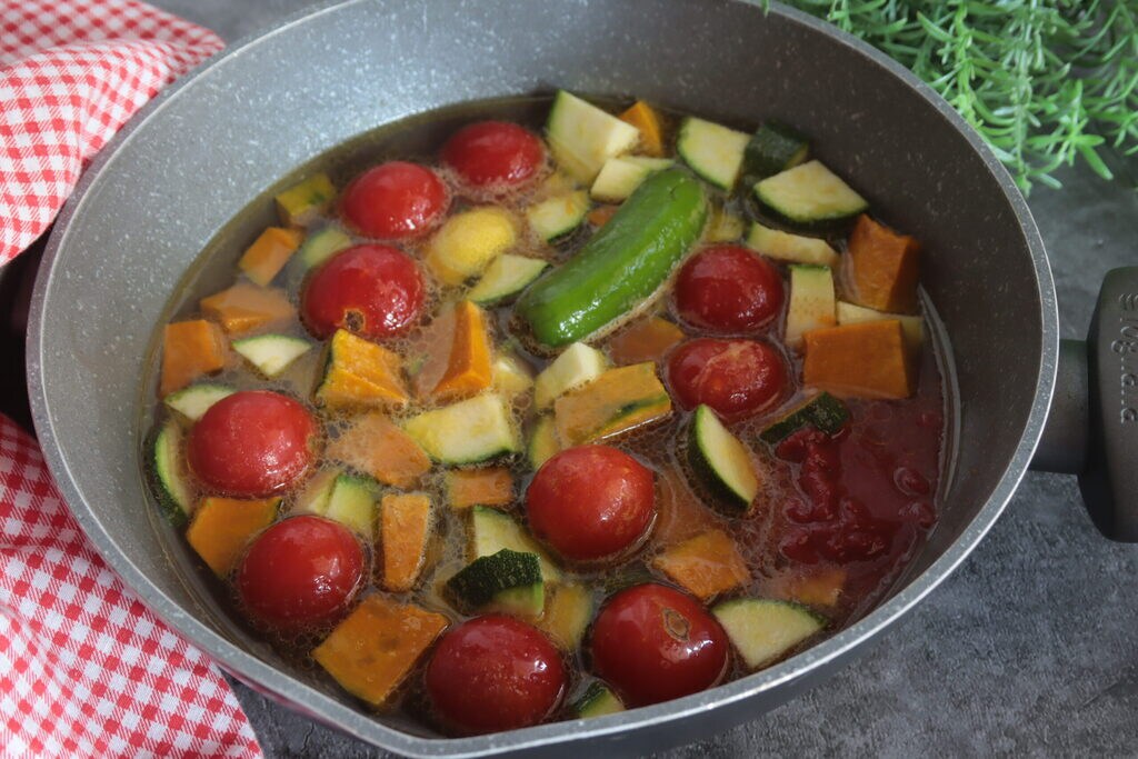 Pendant que le potiron avec les courgettes et le reste cuisaient, j’ai ajouté les petites tomates que j’avais précédemment passées. Faites cuire pendant 35 minutes