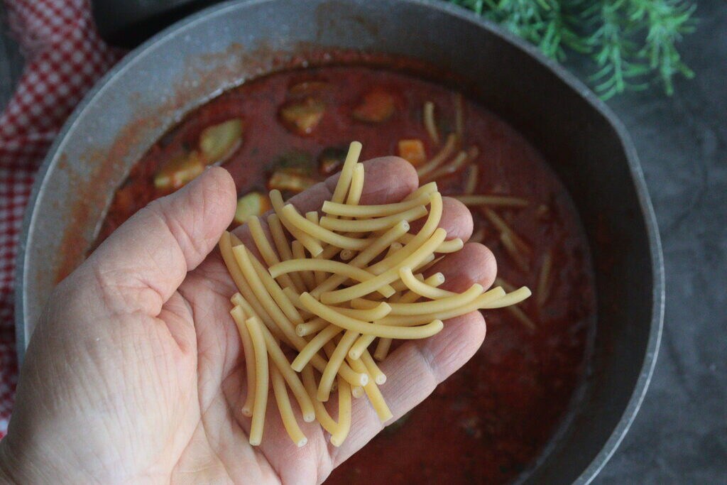 Pour mes pâtes, j’ai pris 10 minutes. Si vous voyez qu’il faut encore de l’eau, ajoutez-en peu à peu. Ayez toujours une petite casserole avec de l’eau bouillante prête.