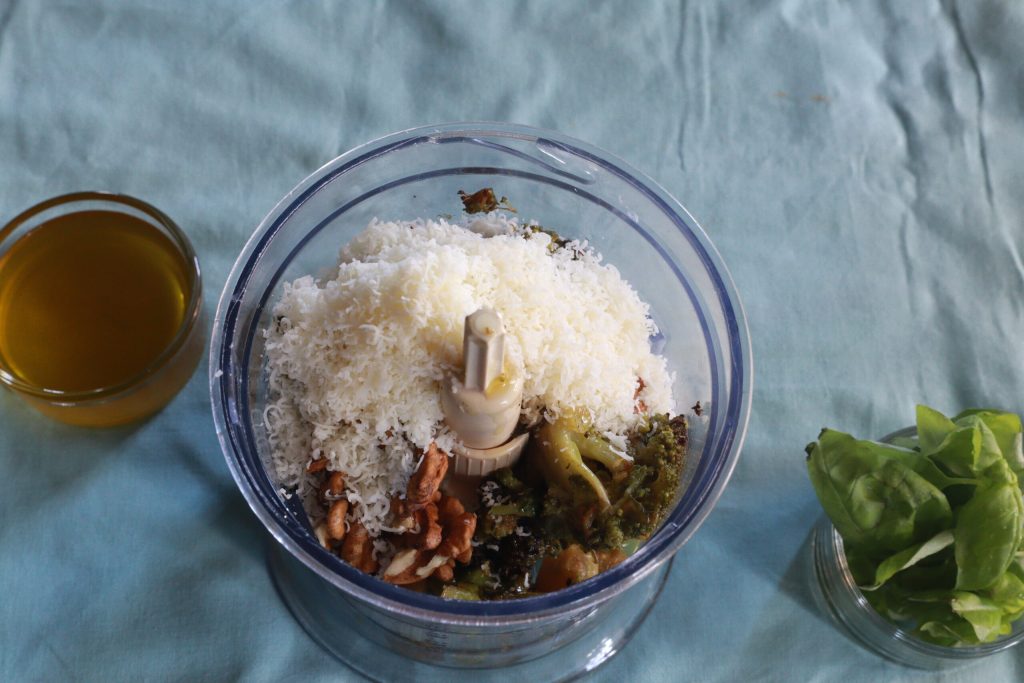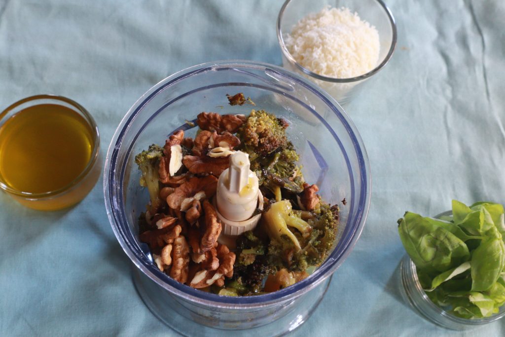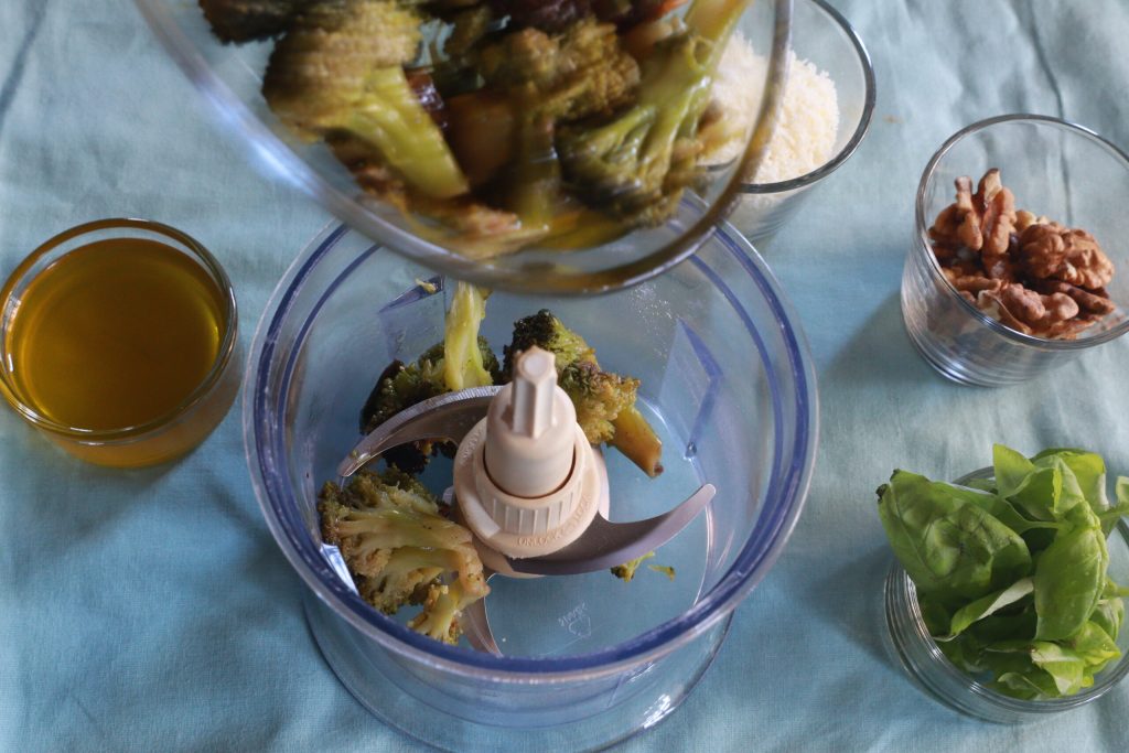 J’utilise beaucoup le hachoir, je le trouve super pratique en cuisine. J’avais des brocolis déjà prêts, un petit reste du dîner, et je les ai mis dans le bol du hachoir.