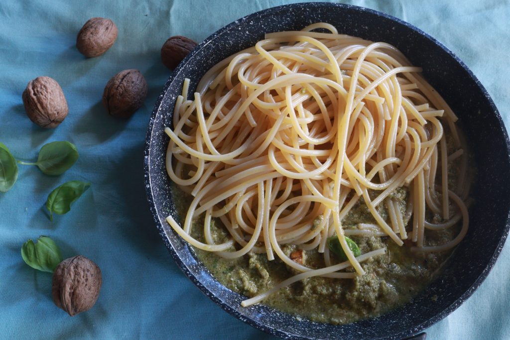 Spaghetti au pesto de brocoli sicilien déjà cuits et sautés. Les spaghetti, vous le savez déjà, occupent une place de choix dans ma cuisine et je ne voyais pas meilleure pâte pour un pesto hyper gourmand. Pour tout vous dire : il me restait une petite assiette de brocoli poêlé en accompagnement de la veille et, comme on ne jette rien, pensiez-vous que je n’allais pas recycler un légume comme le brocoli ? Ni une ni deux, direction le placard pour voir ce que je pourrais ajouter en plus du basilic, de l’ail et de l’huile d’olive extra vierge. Des noix, bien sûr, j’en ai toujours en coque, ainsi que d’autres fruits secs que j’adore. La saison principale du brocoli, c’est justement maintenant : elle commence en janvier et on en trouve encore tout le mois de mars. Profitons-en donc : en plus d’être bon, c’est aussi très sain.