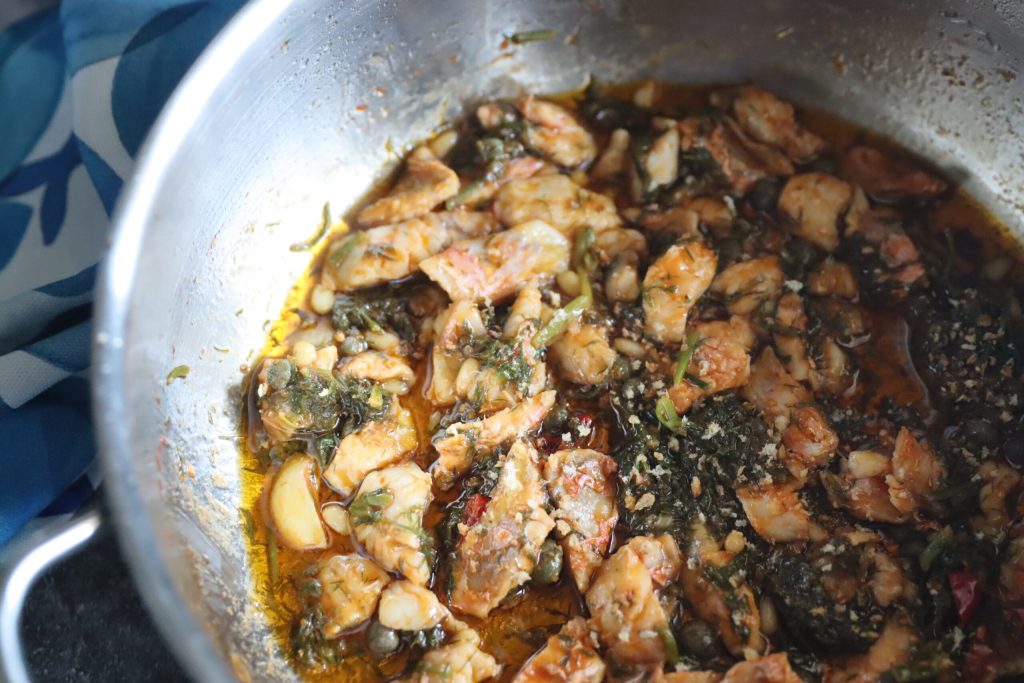 Dans la casserole, mettez l’ail coupé en deux, trois morceaux de piment avec l’huile et quelques tiges de fenouil sauvage.