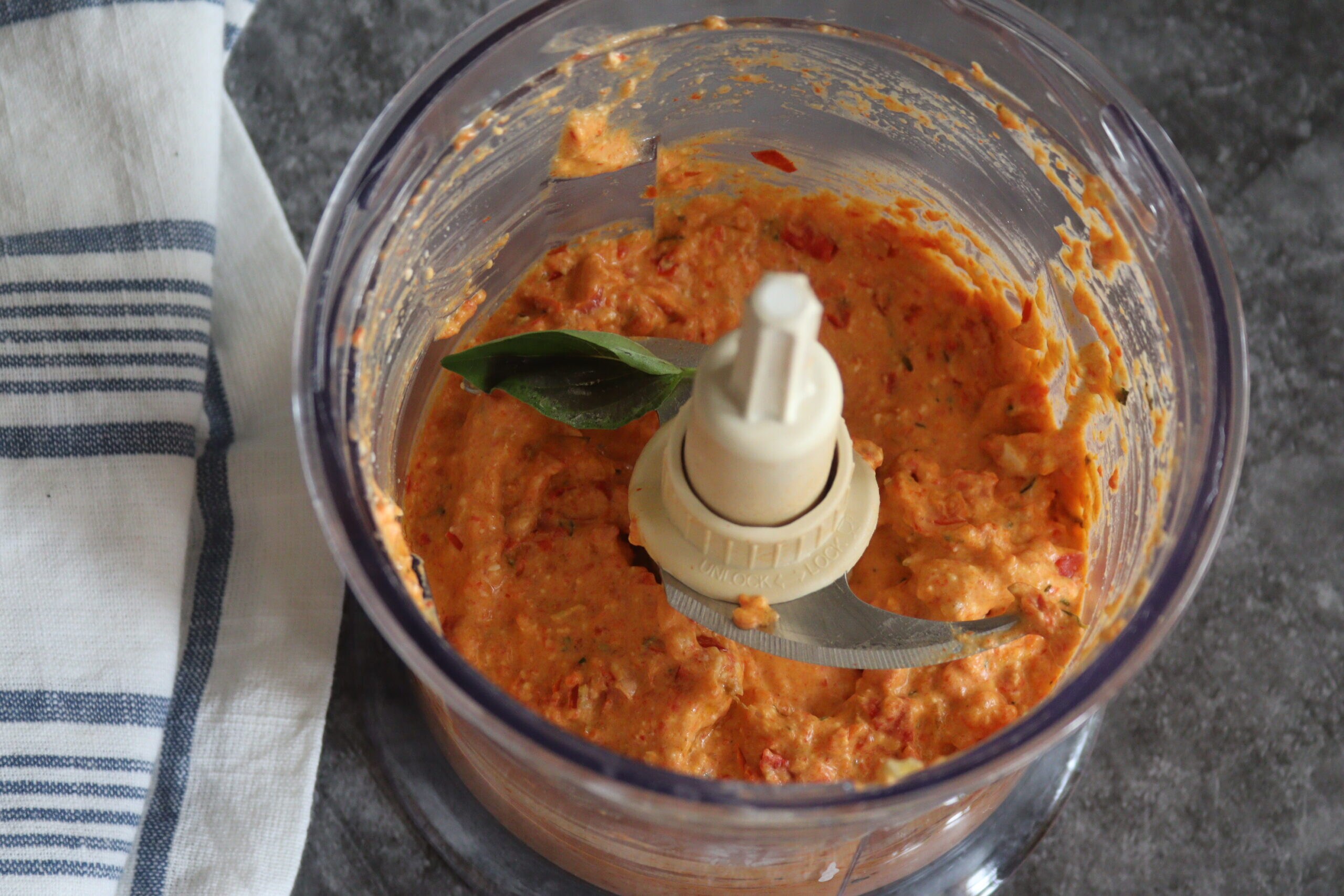 Quelques tours et les poivrons et la feta deviennent une crème extraordinaire prête à assaisonner les spaghetti.
