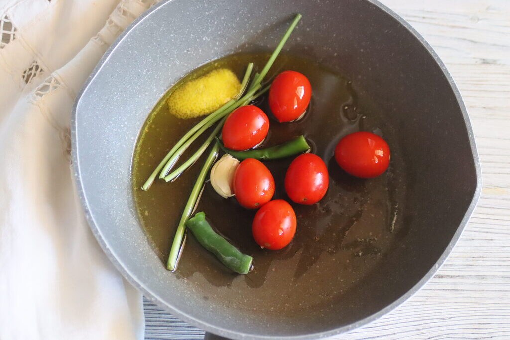 • Pendant que vous faites bouillir l’eau pour les pâtes, préparez la sauce, mettez dans la poêle l’huile d’olive extra-vierge avec le piment, les tomates cerises entières avec le zeste de citron, les tiges de persil avec une gousse d’ail en chemise. Dès que ça commence à cuire, baissez le feu et mettez le couvercle.
