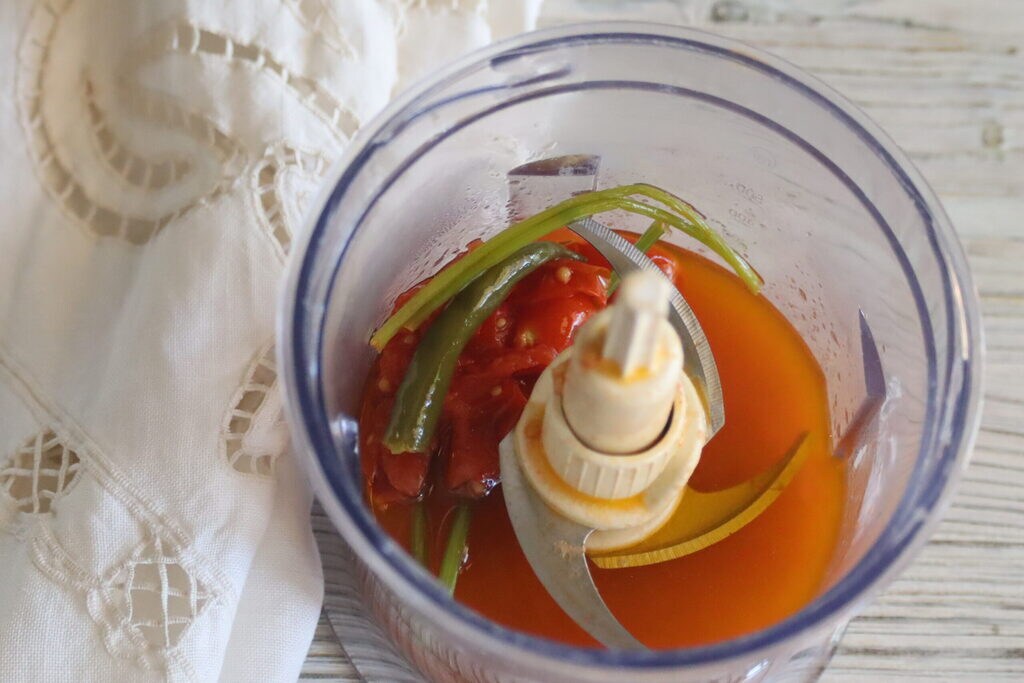 • Avec le hachoir, réduisez en crème la sauce tomate y compris les tiges de persil, l’ail, le zeste de citron et le piment.