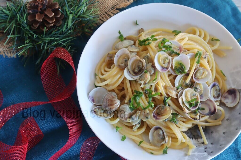 Spaghettis aux palourdes, un plat principal pour la veille de Noël, un classique je dirais, même si chaque jour pourrait être bon pour le préparer. Dans notre pays, les pâtes, et en particulier les spaghettis, mettent tout le monde d’accord sur ce qu’il faut cuisiner, donc les pâtes, le moment du premier plat devient une fête, apporter à table un plat de pâtes satisfait et comble, surtout si, comme dans ce cas, on l’accompagne de palourdes. Parfois, les palourdes sont meilleures que les vraies coques, même si je les aime toutes les deux. Il y a peu de différences, les palourdes sont plus petites et ont des antennes très courtes par rapport aux vraies qui sont plus grandes et ont des antennes plus longues.