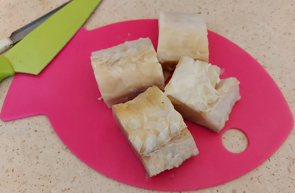 La peau du stockfish ne doit absolument pas être retirée. Du moins dans ce cas. On ne frit rien, on met tout en couches et il ne faut pas tourner. C’était la méthode de maman qui est devenue la mienne aussi.