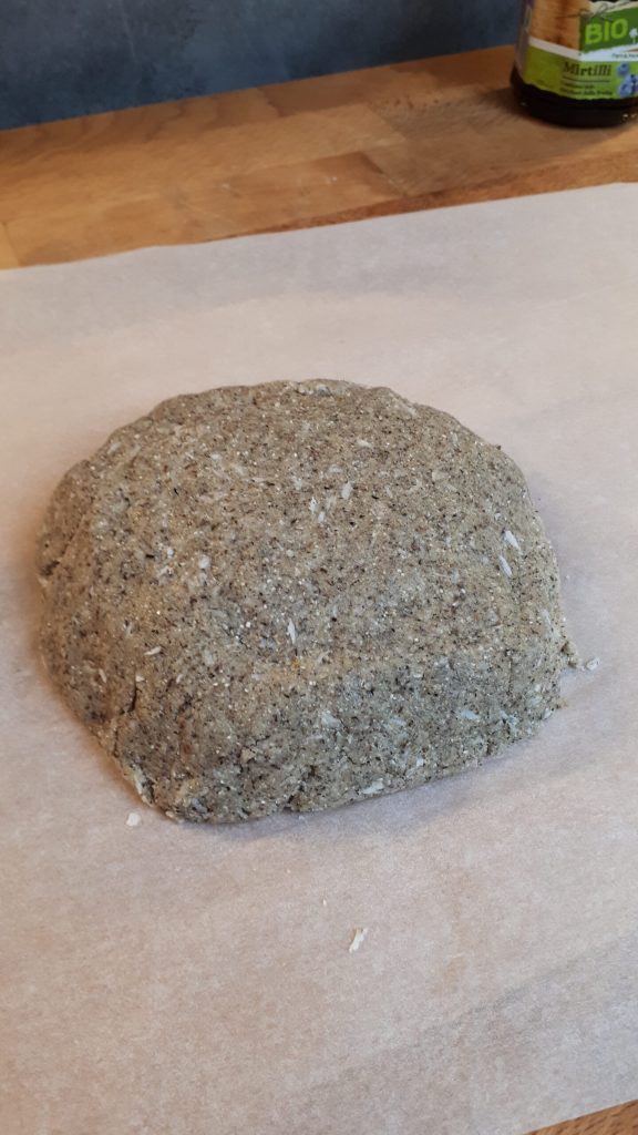 À l’aide du papier sulfurisé et du rouleau à pâtisserie, étalez délicatement le mélange sur une plaque de 22 cm