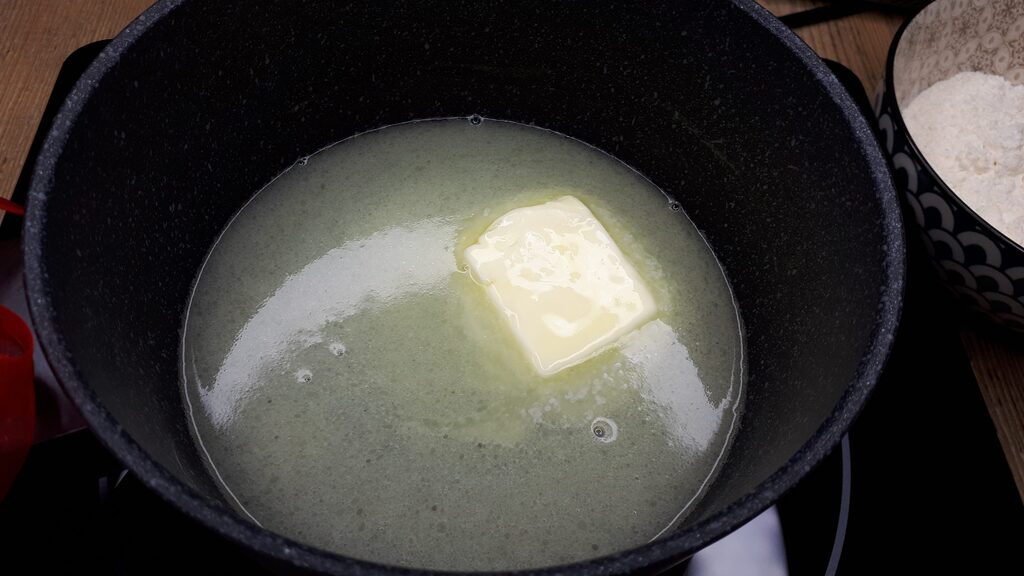 Mettez dans une casserole l’eau avec le beurre, portez à ébullition en remuant toujours jusqu’à ce que le beurre soit fondu. Éteignez le gaz et versez d’un seul coup la farine tamisée.