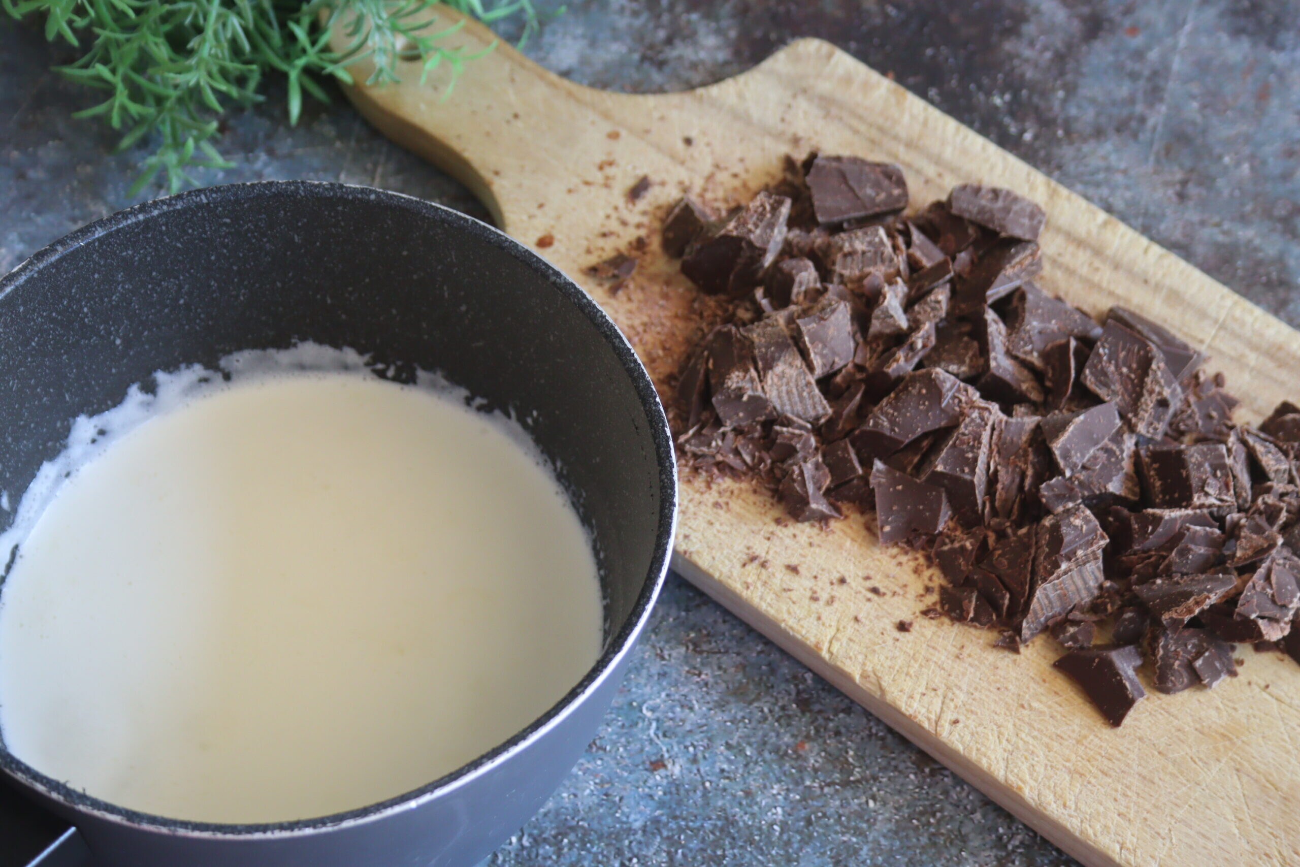 Je prépare tout de suite la ganache pour recouvrir les truffes au chocolat. Je fais bouillir la crème et je retire la casserole de la source de chaleur, j’ajoute le chocolat noir coupé en morceaux.