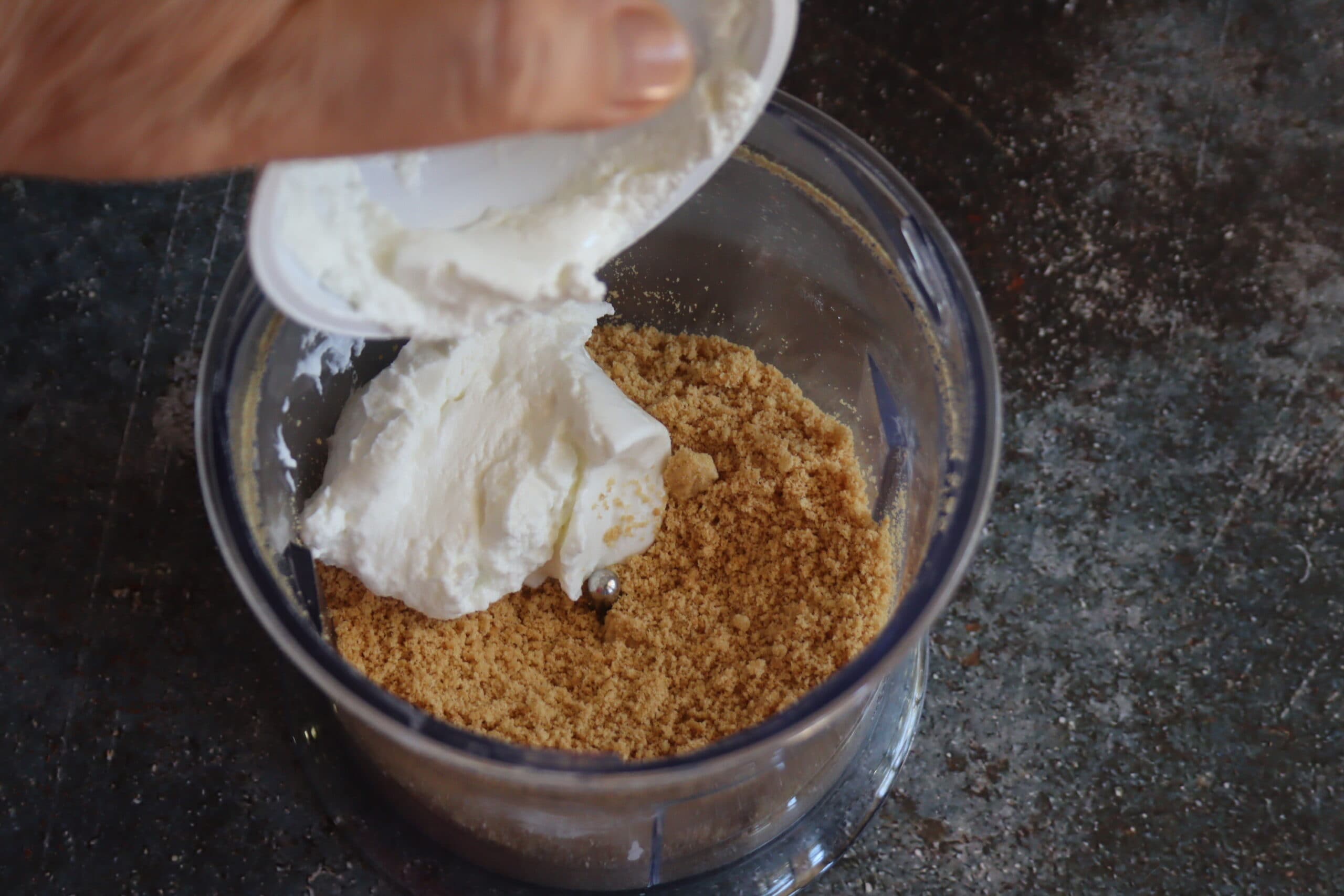 Dans le récipient du hachoir, je mets les biscuits et les noisettes grillées, je les mixe jusqu’à obtenir une poudre grossière.