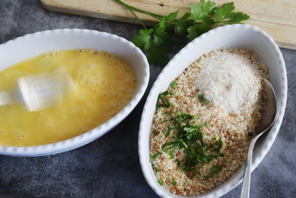 Dans les deux bols, j’ai mis dans l’un l’œuf légèrement battu et dans l’autre la chapelure avec du parmesan râpé, du persil frais haché et du sel. Dans ce cas, je n’ai pas ajouté de poivre noir.