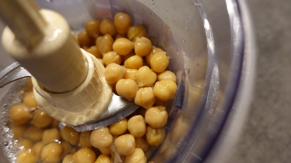 Mixez-la avec les pois chiches et, si nécessaire, ajoutez aussi l’eau de cuisson des pois chiches.
