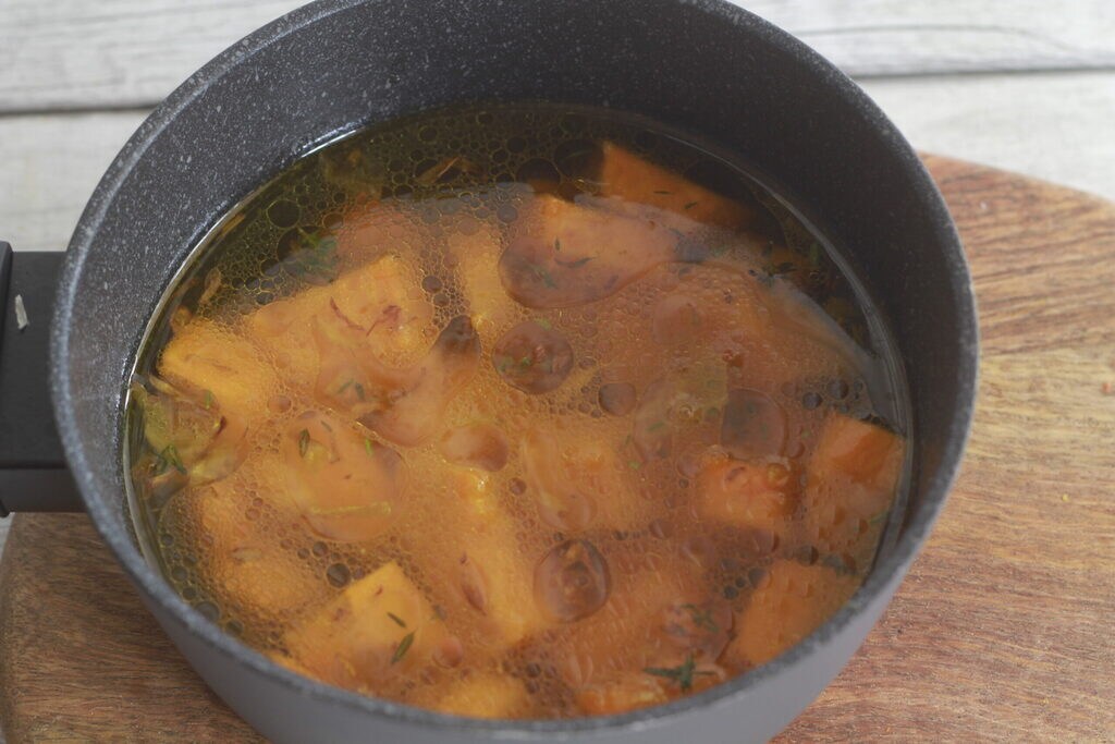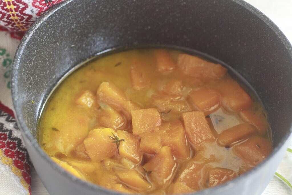 Je fais légèrement chauffer le potiron et j’ajoute l’eau, je laisse cuire pendant vingt minutes.