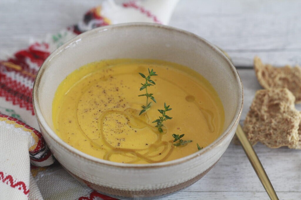 Velouté de potiron, ou soupe, est pratiquement une purée allongée avec du bouillon ou de la crème (si vous voulez la rendre plus légère, le lait convient aussi). Habituellement, elle se consomme chaude. Mais vous apprécierez sûrement aussi la version froide du velouté de potiron, tout simplement très agréable. Très appréciée en Europe et pas seulement, nous savons avec certitude que c’est l’un des nombreux plats populaires utilisés lors de Thanksgiving aux États-Unis. Le velouté de potiron doux comme un pull en cachemire. Maintenant que c’est la saison du potiron, je le congèle coupé en petits morceaux dans des sacs prêts en portions, au moment de l’utilisation, évidemment cru et il n’est pas nécessaire de le décongeler avant de l’utiliser.