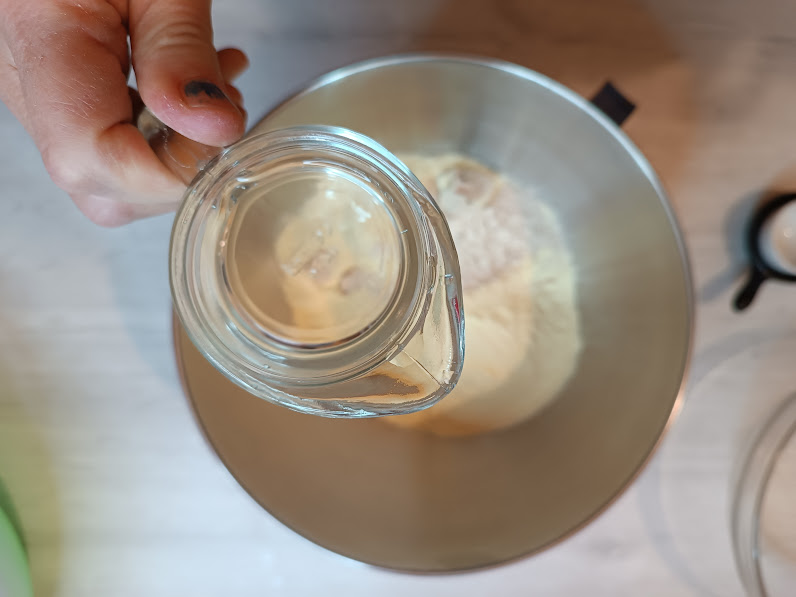 • Le matin, pétrissez la farine avec l’eau tiède après avoir dissous la levure dans la première moitié ; ajoutez le sel vers la fin. Pétrissez au moins 10 minutes pour bien lier la pâte. Couvrez et laissez reposer au réfrigérateur. Deux heures avant la cuisson…