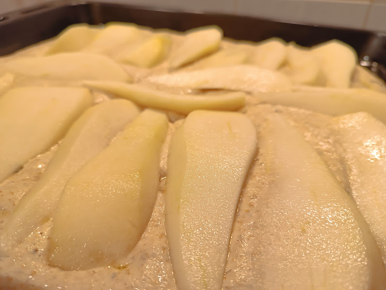 Après avoir pétri les ingrédients, j’ai laissé lever la focaccia pendant bien dix heures, permettant ainsi aux arômes de se développer et au pain de devenir moelleux et léger. Pendant la levée, j’ai étalé la pâte sur une plaque et je l’ai couverte avec de généreuses tranches de poires Abate. Cette variété de poires, avec leur chair douce et juteuse, se marient parfaitement avec l’intensité du gorgonzola.