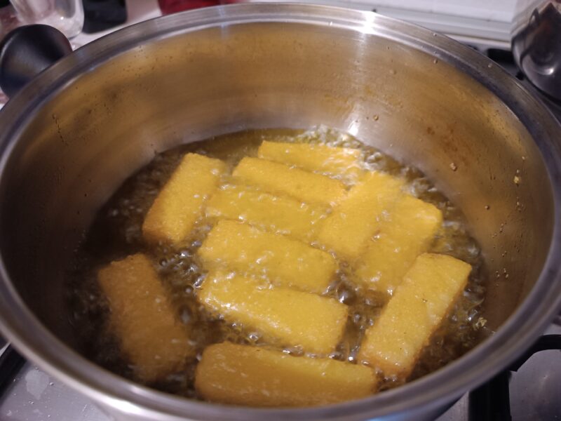 La polenta peut être utilisée en cas de restes, ou préparée la veille; l’important est la farinage avec de la farine de maïs qui donnera un croquant total aux bâtonnets. Elle se conserve sans problème jusqu’au lendemain au réfrigérateur.