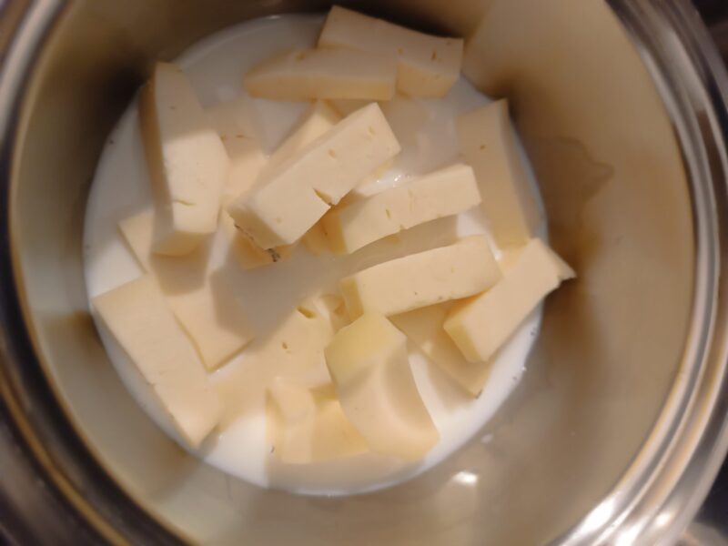 Dans une petite casserole, faites fondre le beurre à feu doux, ajoutez la farine blanche et le lait en remuant continuellement; enfin, ajoutez la toma et faites fondre.