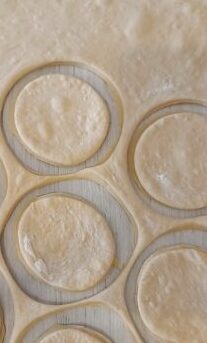 Étalez maintenant votre pâte sur une épaisseur d’environ un cm ; j’ai préféré découper des disques, qui deviendront des petites boules, ou des petites couronnes.