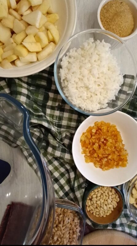Avant de commencer, assurez-vous d’avoir tout à portée de main, faites cuire le riz, le farro ; épluchez les pommes et les poires et coupez-les en morceaux ; pesez tout le reste et cassez les œufs…