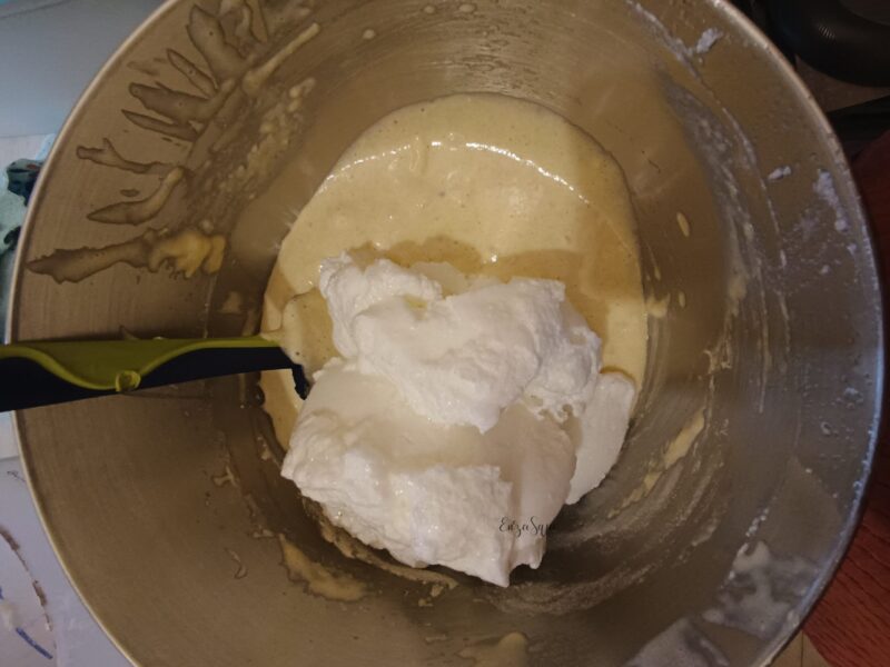 Après avoir monté les œufs, ajoutez délicatement les deux farines et mélangez soigneusement