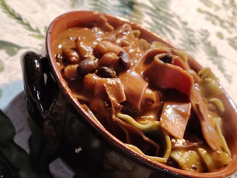 Il se conserve au réfrigérateur, si des haricots restent, vous pouvez assaisonner les pâtes, j’avais des maltagliati prêts et je les ai utilisés. Excellent si légèrement épicé, mais vous pouvez omettre le piment