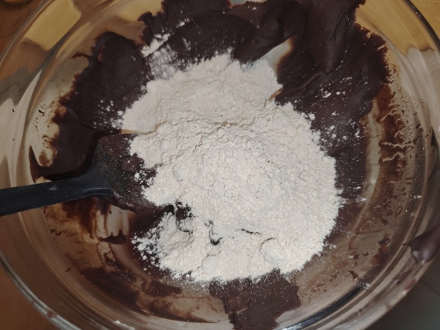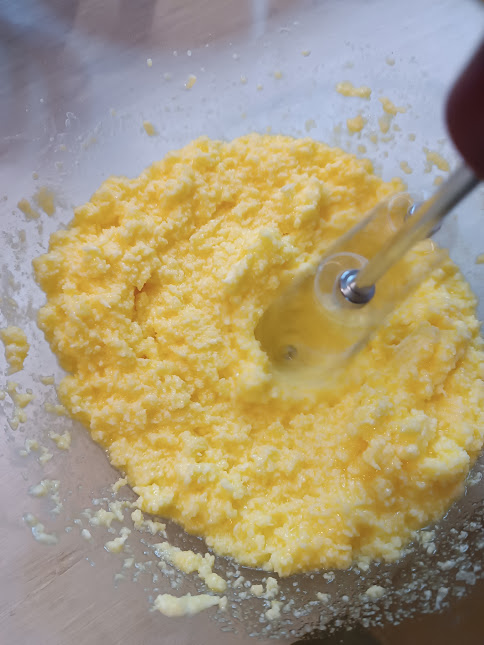 • Dans un bol, mélanger ensemble le beurre mou, le sucre en poudre et les œufs, jusqu’à obtenir un mélange granuleux. Ajouter les farines, la levure et pétrir rapidement.
