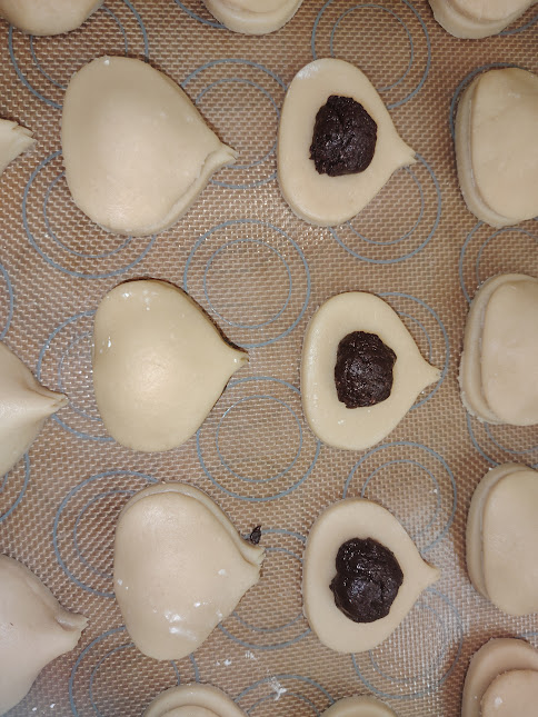 • Étaler la pâte et découper les formes, placer une boule de garniture et couvrir.