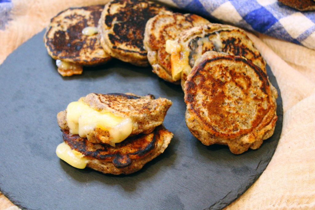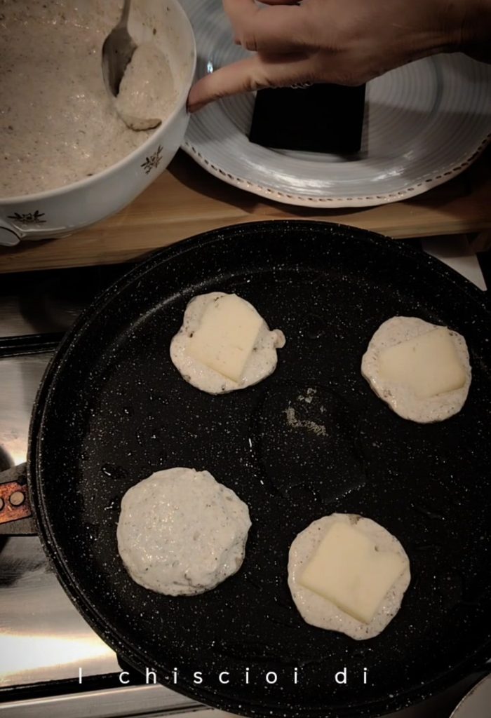• Graissez la plaque ou la poêle et avec une cuillère, faites des disques d’environ 6 cm; faites cuire un peu et placez le fromage au centre. Couvrez avec une autre cuillerée de pâte. Retournez jusqu’à cuisson complète.