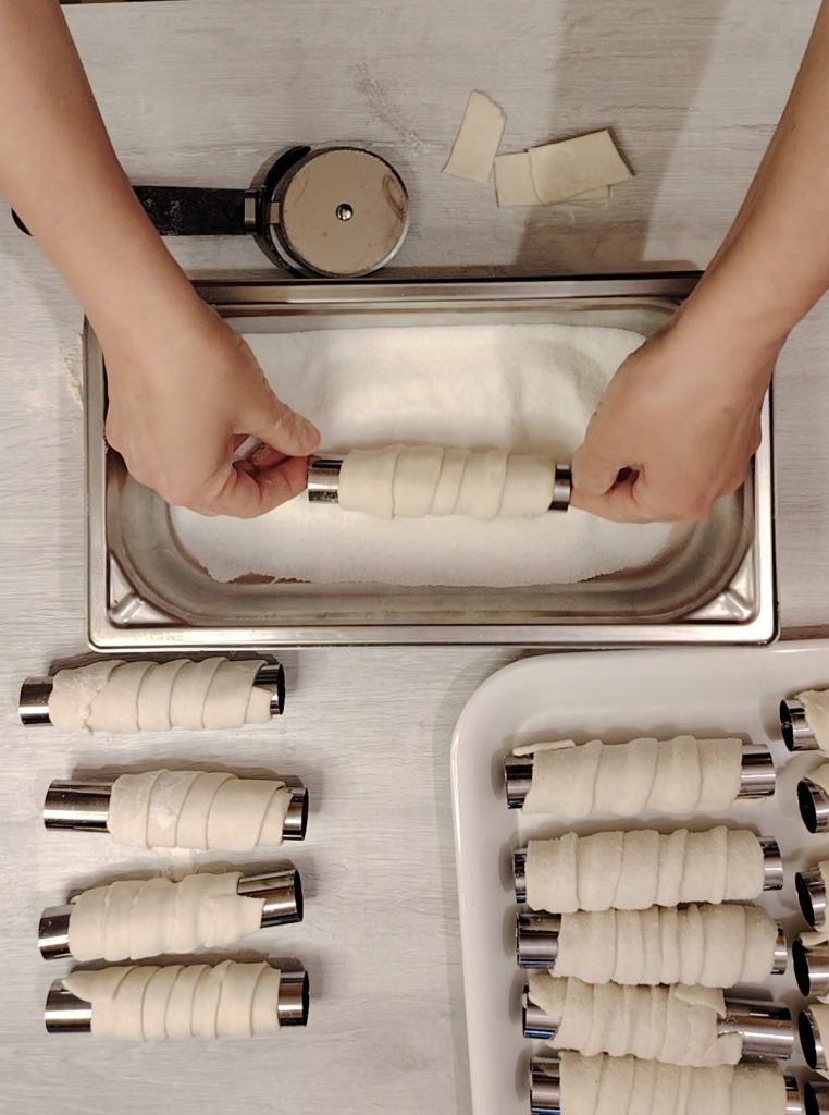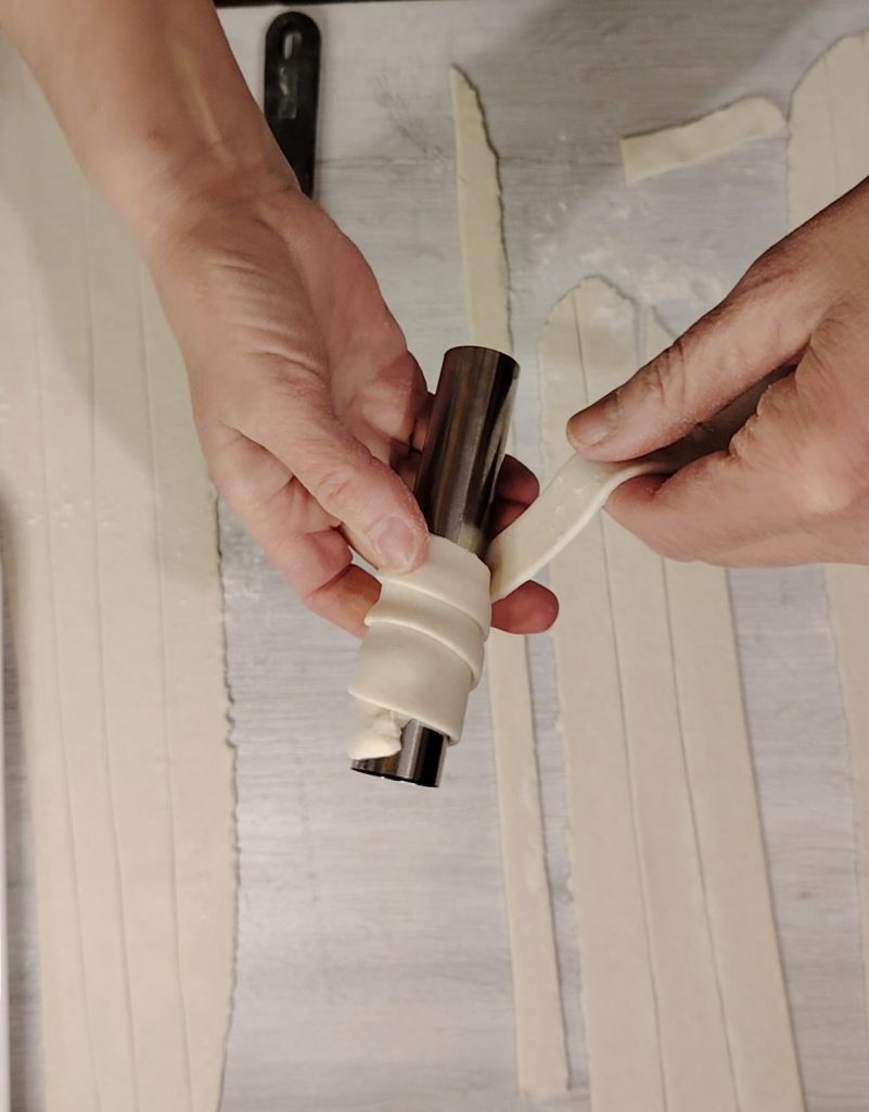 Une fois la pâte feuilletée terminée, vous pouvez maintenant procéder à l’étalement final, après avoir divisé le bloc en quatre portions égales. Pendant que vous travaillez la première, laissez le reste au froid bien emballé. Comme mentionné ci-dessus, j’ai utilisé la machine à pâtes, mais si je dois faire peu, j’utilise le rouleau à pâtisserie. Découpez ensuite des bandes d’environ 40 cm de long et enroulez-les autour du tube pour cannoli.
