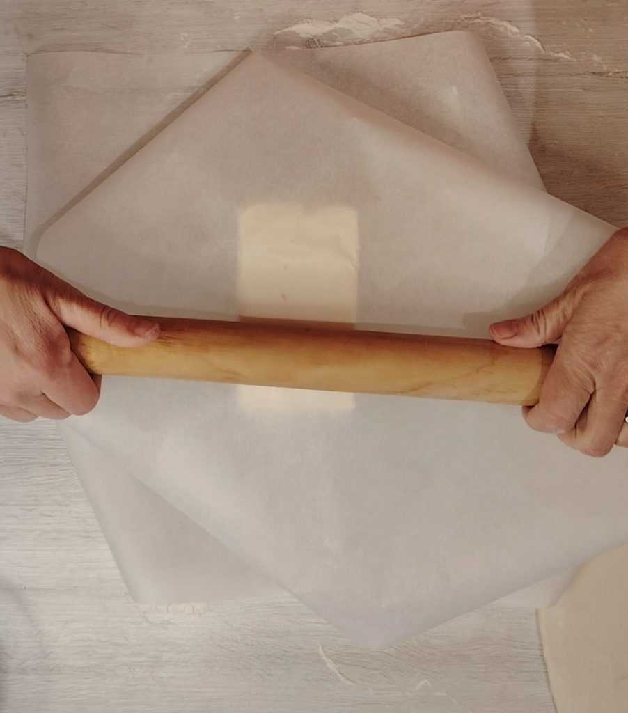 Situez le beurre à température ambiante entre deux feuilles de papier sulfurisé et aplatissez-le avec l’aide du rouleau à pâtisserie, jusqu’à ce qu’il soit aussi fin que la pâte feuilletée obtenue avec la pâte. (Dans la vidéo, tous les étapes sont présentes).