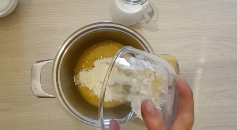 • Maintenant, vous pouvez faire cuire votre crème sur le feu, en faisant attention qu’elle ne colle pas. Vous devez obtenir une crème consistante