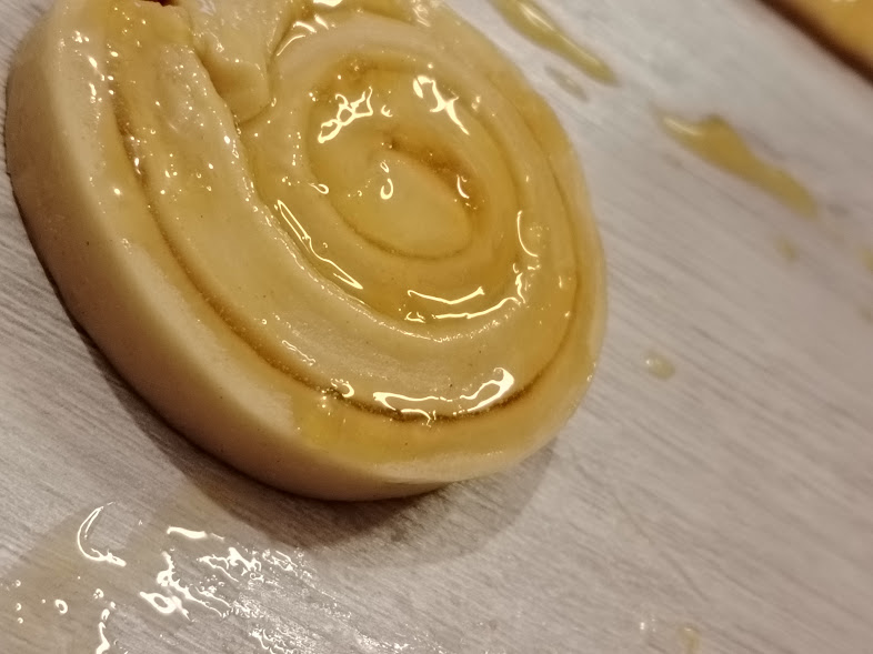 • Découpez des bandes d’un cm de largeur et de 30 cm de longueur. Essayez et ajustez-vous selon vos goûts, tenez compte qu’elles lèveront encore jusqu’à doubler de volume. Badigeonnez de gelée d’oranges ou de confiture.
