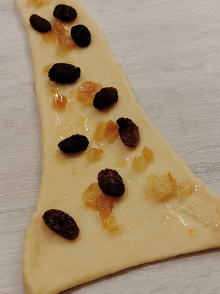 • Avec l’autre moitié de la pâte, découpez des triangles et garnissez de fruits confits et de raisins secs, enroulez
