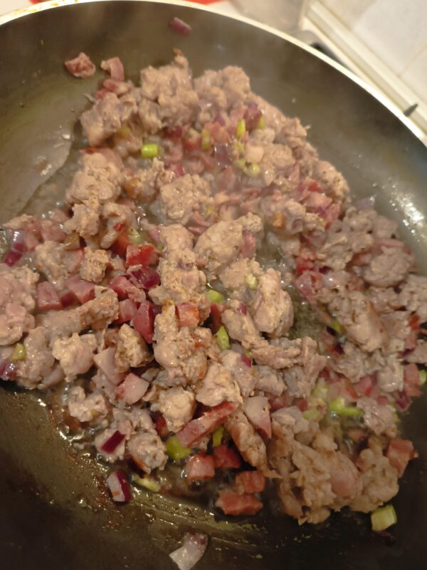 Dans un bol, mélangez les viandes cuites précédemment et le salami cuit coupé en petits morceaux, ajoutez les œufs, le fromage et le sel.