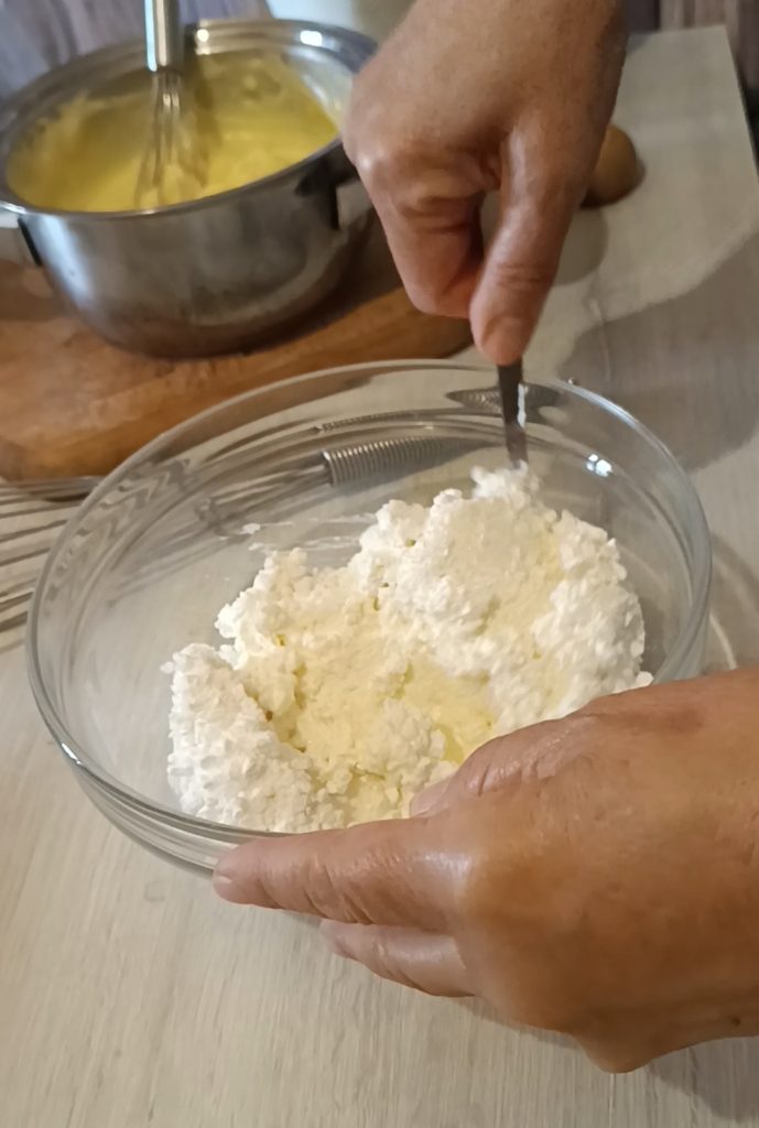 Bien mélanger la ricotta avec le sucre et l’incorporer à la crème pâtissière, et enfin le jus de citron tamisé, bien mélanger pour obtenir une crème fluide et recouvrir d’un film plastique jusqu’à son utilisation
