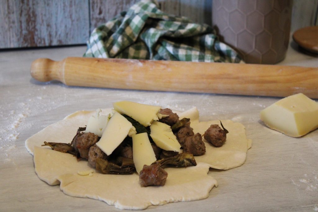 Comme écrit ci-dessus, l’étape précédente manque. Vous voyez la pâte dentelée car ce sont des restes de cannellonis préparés précédemment et que j’ai immédiatement réutilisés. Trop peu pour congeler, et puis il faut bien manger quelque chose !😜 Nettoyez les artichauts et coupez-les en fines tranches, si vous préférez vous pouvez les blanchir au préalable. Coupez la saucisse en morceaux, hachez les herbes aromatiques et coupez le fromage en morceaux ou en tranches. Faites revenir la saucisse dans un peu d’huile d’olive, ajoutez les artichauts et faites cuire en ajustant le sel. Laissez refroidir. Si fraîche, étalez votre pâte et disposez la garniture, le hachis aromatique et le fromage.