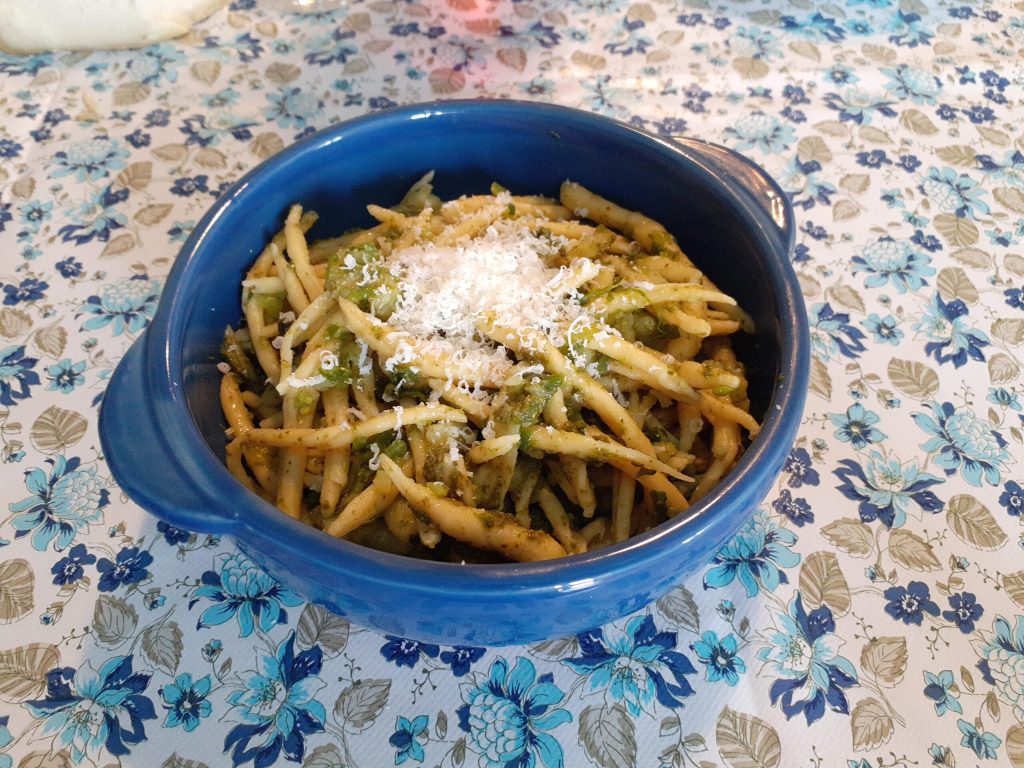 Des pâtes aux œufs avec pesto, haricots verts et pommes de terre.