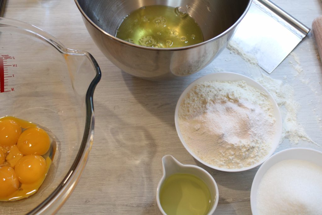 Ajoutez maintenant la farine tamisée avec la levure, réduisez la vitesse du fouet et mélangez bien ; incorporez finalement l’huile, peu à peu, en continuant à mélanger.