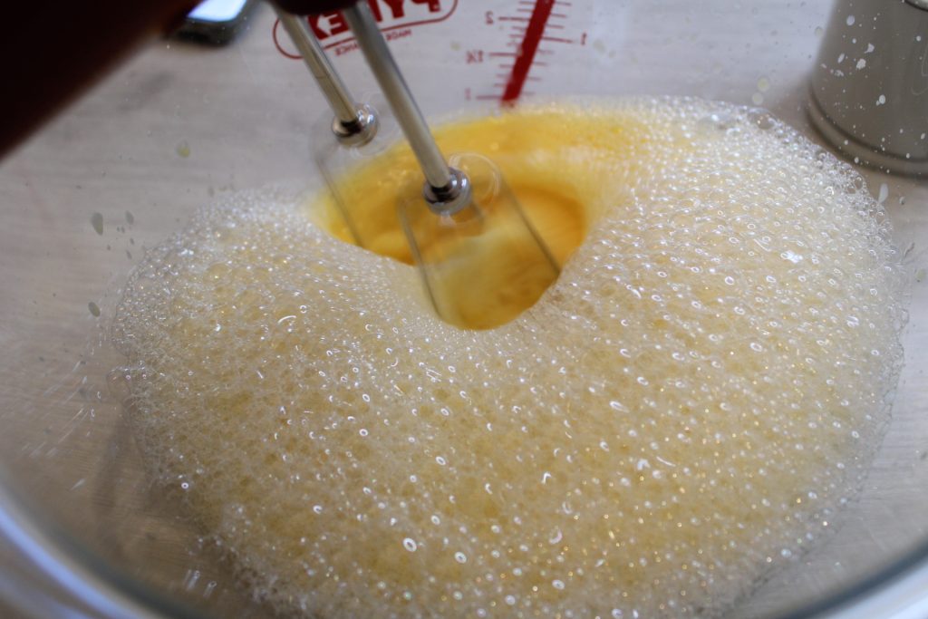 Entre-temps, montez les jaunes dans un grand bol avec l’eau jusqu’à ce qu’ils deviennent une belle mousse.