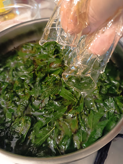 • Nettoyez bien toutes les feuilles de toute impureté. Faites-les bouillir avec l’eau et le sucre, en attendant faites tremper la gélatine dans un peu d’eau froide