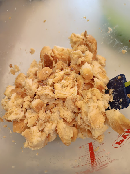 Après avoir fait tremper le pain rassis avec le lait, émiettez bien…