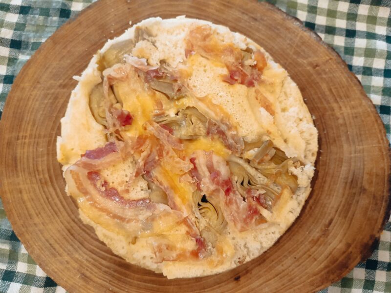 Une pizza rustique, une surprise à apporter à table, à faire aussi en portions individuelles dans le four à bois, garniture croustillante, qui avec la chaleur fait bien rôtir les artichauts, créant une croûte croustillante et savoureuse… Résultat top