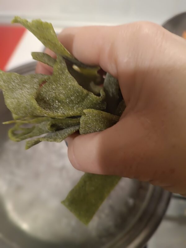 Les lanières vertes aux légumes sont un plat simple et délicieux que j’ai appris à préparer grâce à mon habitude de ne rien jeter. Il s’agit de pâtes coupées de manière désordonnée et rangées de manière tout aussi désordonnée, créant ainsi les lanières. Ce nom m’a été suggéré par une dame âgée qui m’a montré comment elle préparait ses pâtes maison, en me disant que je pouvais les assaisonner à l’aventure, en ouvrant le garde-manger et en choisissant les ingrédients en fonction de ce que j’avais à disposition. Depuis ce jour-là, mes chutes de pâtes sont devenues les « lanières ». Ce qui est bien avec ce plat, c’est que je peux les assaisonner toujours de manière différente, en suivant les saisons et en utilisant les légumes frais que je trouve. C’est une manière créative d’utiliser les restes et de créer toujours de nouvelles recettes. Ainsi, pendant que je me régale de mes lanières vertes aux légumes, je me sens chanceuse d’avoir cette habitude qui me permet d’expérimenter et de déguster toujours des plats uniques et savoureux.