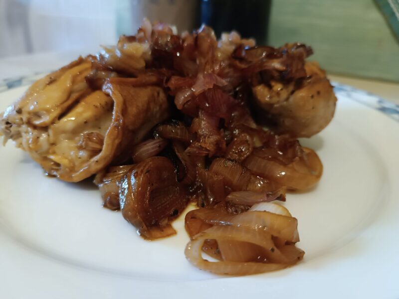 Il m’arrive aussi de cuisiner de la viande de temps en temps, je n’en suis pas particulièrement friand, mais mon conjoint carnivore mérite de l’attention… C’est pourquoi aujourd’hui je vous propose la recette du lapin aux oignons caramélisés.