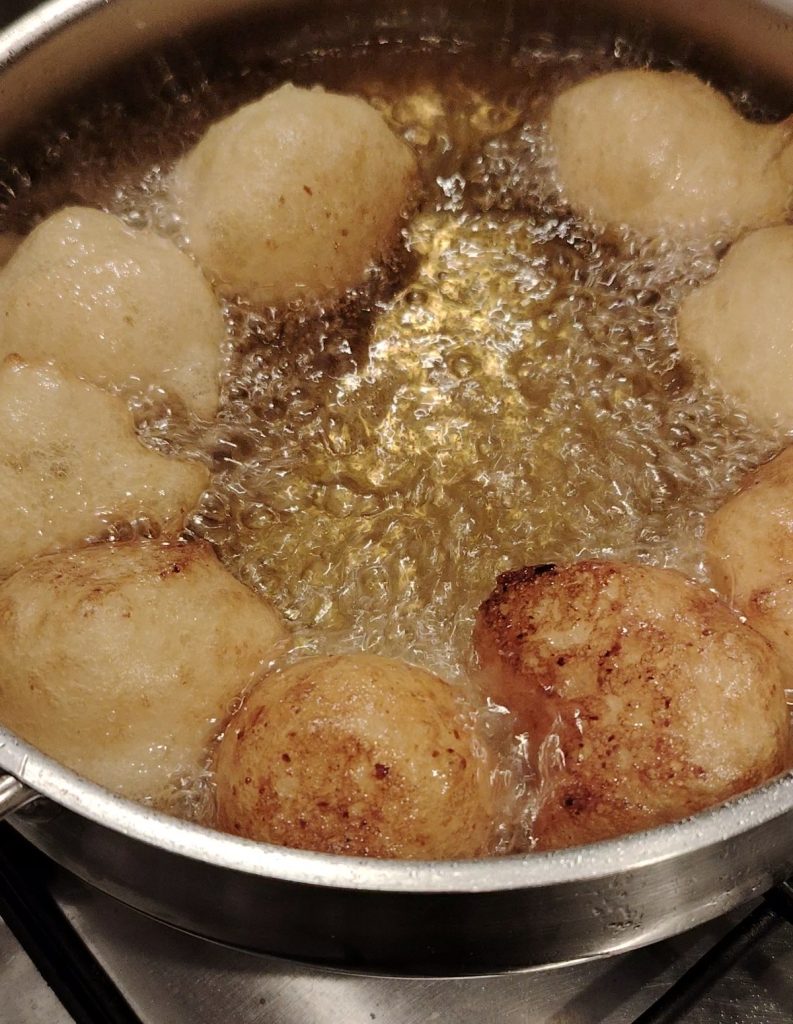 Tout se passait dans une bassine en plastique bleu ovale, avec deux grosses poignées. Comme celles que je vois encore aujourd’hui dans certaines fermes, utilisées aussi pour le pain quand il n’y avait pas de pétrin. Puis vient le moment de l’attente. La pâte était couverte d’un drap blanc tissé de chanvre, épais et rugueux. Et au-dessus, pour protéger le tout, on étendait une couverture qui servait uniquement à cet effet : conserver la chaleur nécessaire pour faire lever la pâte lentement. Une fois prête, cette pâte était plongée dans l’huile bouillante en petites quantités, se transformant en bouchées dorées et savoureuses. Il en fallait peu pour les rendre parfaites. Sel ou sucre ? Encore aujourd’hui, je continue à préparer mes beignets simples, une pâte qui a le goût de la jeunesse et de la continuité, un lien avec les belles choses. Le meilleur moment est toujours celui-ci : les jours qui précèdent Noël.