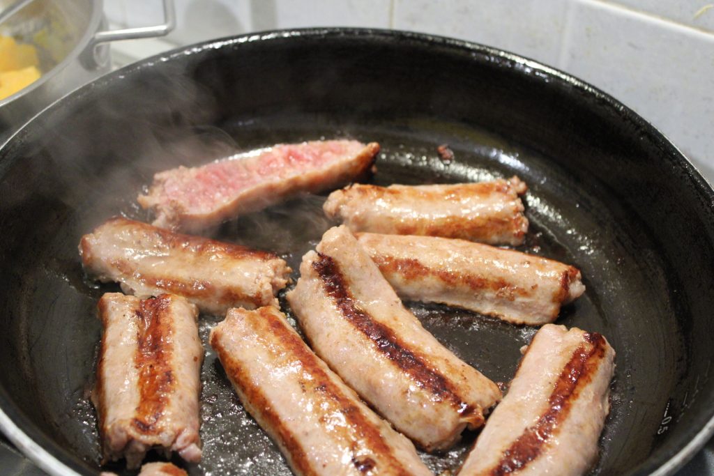 - 10 tranches saucisse de porc, fraîche, cuite, à la poêle (J'ai préféré la saucisse au fenouil. Coupée en deux et rissolée.)