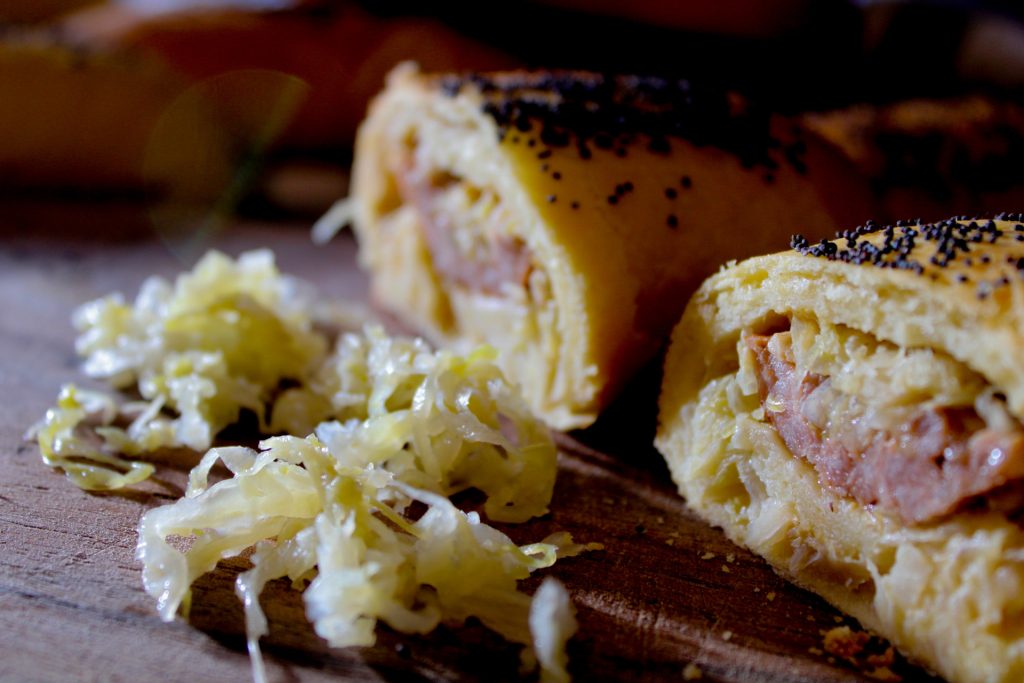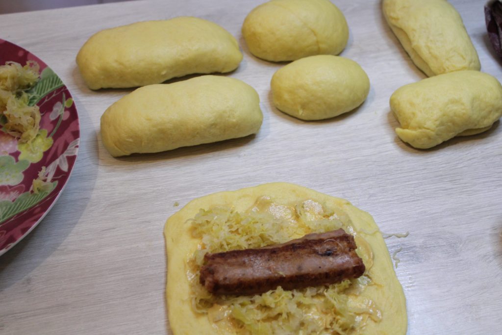 Dès que la pâte est prête, divisez en dix parties et faites des rectangles. Étalez de la moutarde, ajoutez la choucroute et puis la saucisse. Fermez soigneusement pour former des petits pains, que vous ferez lever à nouveau. Avant d’enfourner, badigeonnez avec œuf et lait et si vous aimez, saupoudrez de graines. Cuisson dans un four préchauffé à 190 degrés pendant environ 30 minutes.