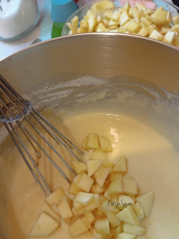 Enfin, ajoutez les arômes ou les fruits… Dans ce cas, pommes à l’intérieur et éclats d’amandes en surface. Faites cuire à 180 degrés dans un four déjà chaud pendant environ 20 minutes