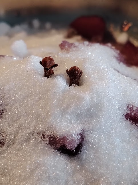 Le matin, égouttez et ajoutez le sucre et les clous de girofle, mélangez et laissez macérer jusqu’au matin suivant. Laissez-les sans couvercle.